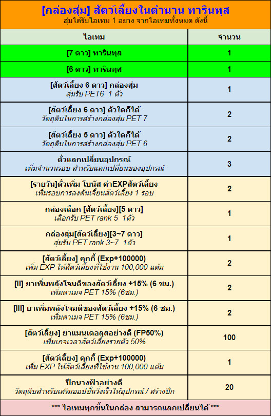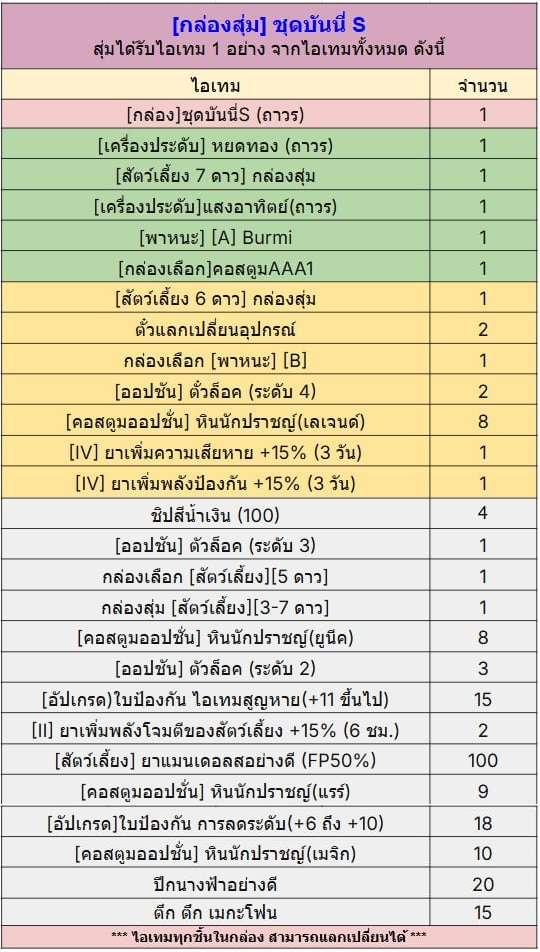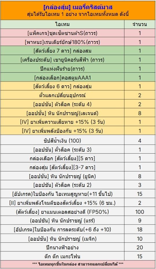 คุณสมบัติ: ภายในกล่อง จะสุ่มได้รับไอเทม 1 อย่าง จากลิสต์ไอเทม ดังนี้